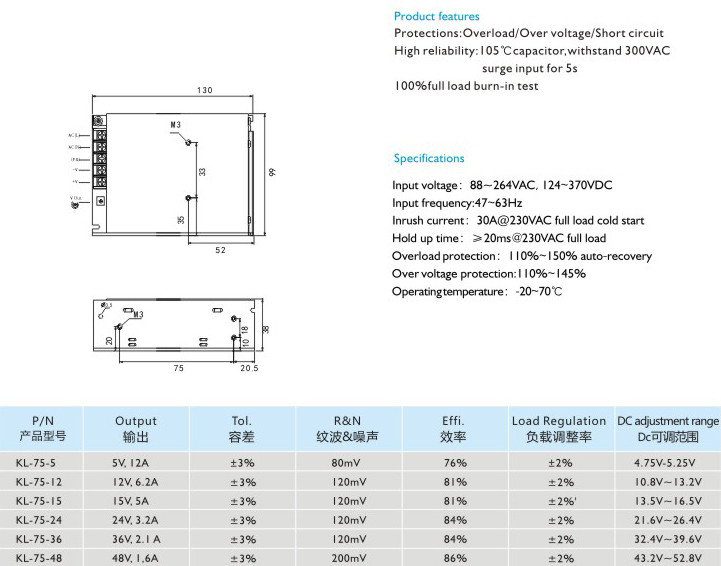 高可靠性:105C長(zhǎng)壽命電容,能承受300VAC輸入電壓5秒不損壞 100滿載老化測(cè)試 輸入電壓:88-264VAC124-370VDC 輸入頻率:47~63Hz 沖擊電流:30A@230VAC滿載冷態(tài) 保持時(shí)間:≥20ms@230VAC滿載 過(guò)載保護(hù):110%-150%自動(dòng)恢復(fù) 過(guò)壓保護(hù):110%~145% 運(yùn)行溫度:-20-70℃" />
